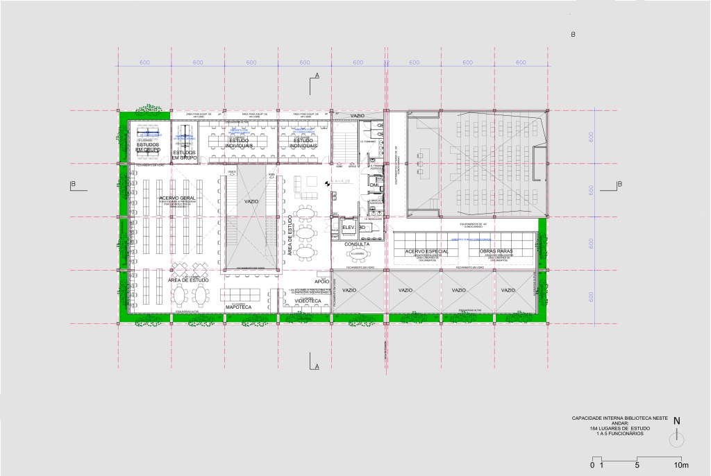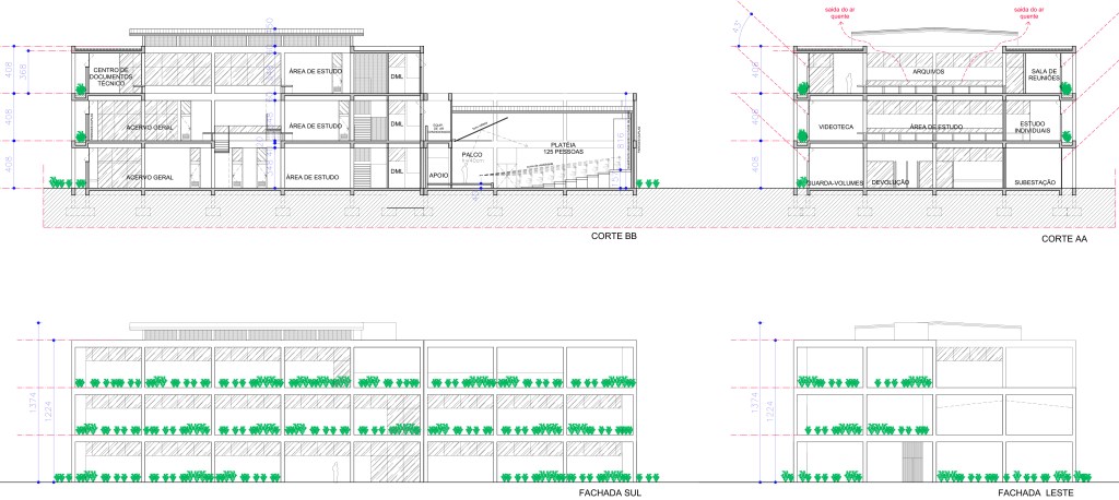 The structural solution seeks to adopt concrete construction complemented by metal structures in the roofs of the central atrium and auditorium. A 6.00m x 6.00m grid was drawn to organize the structure and limit the spans. Building built in 2 cores (Collection and Auditorium) has a structural expansion joint. It is also composed of blocks of stairs and elevators in addition to the upper level cover.