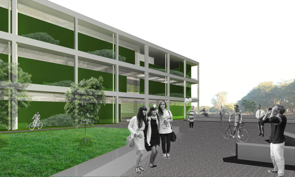 The general concept of the building is based on a simple and fast construction that guarantees maximum environmental qualification. The plan organization proposes the creation of a vegetal “barrier” around the masonry, this retreating possibility a better ambience to the places of study and permanence. Higher conditions through the central churchyard make the hot air move from the Library.